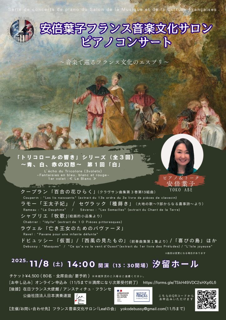 (11月5日まで※満席になり次第受付終了)主催・お問い合せ先:フランス音楽文化サロン「Leafの会」